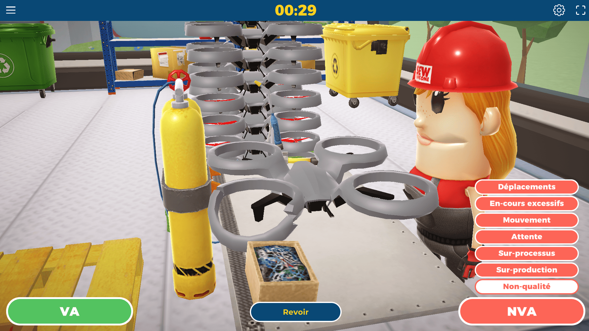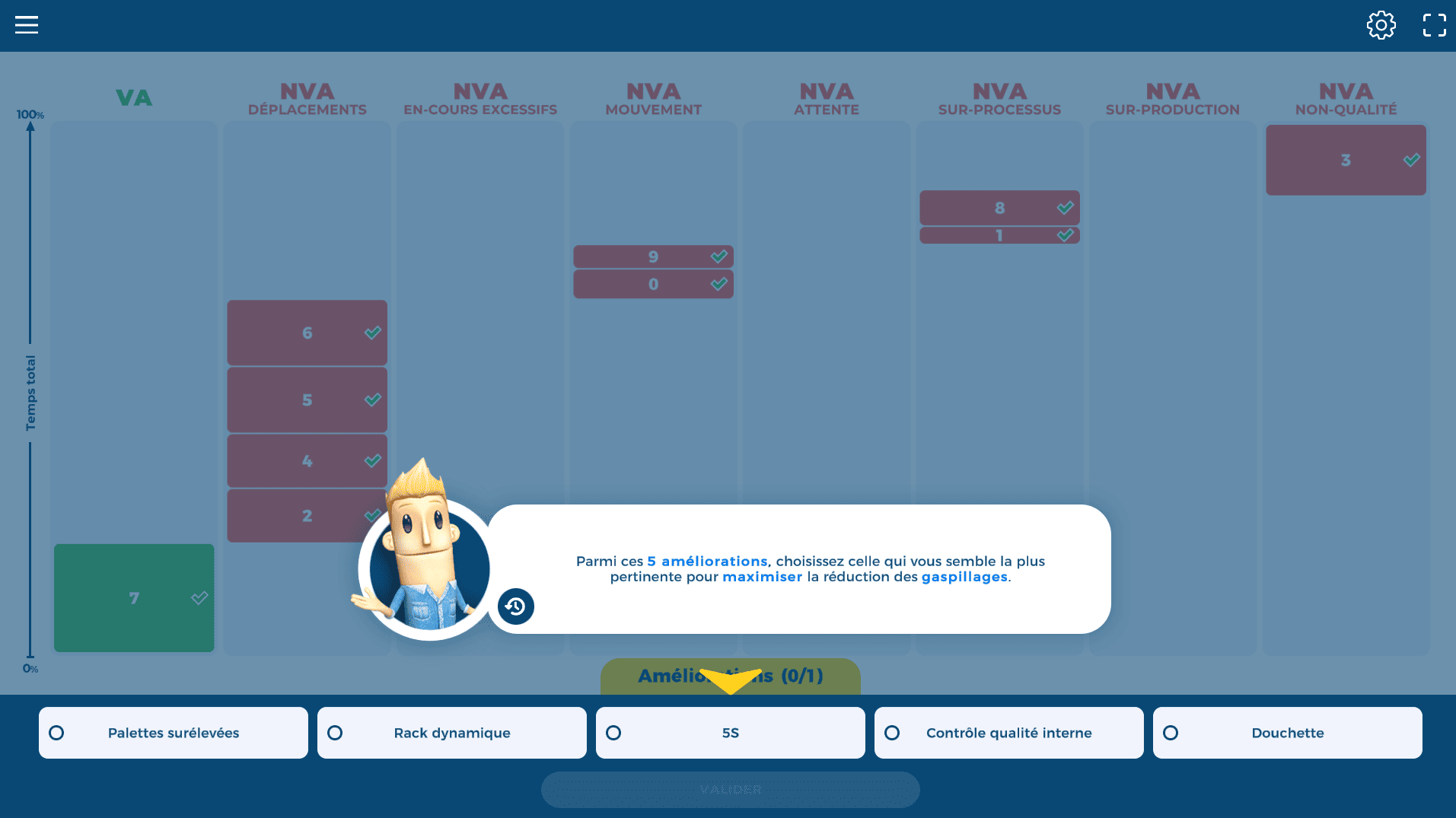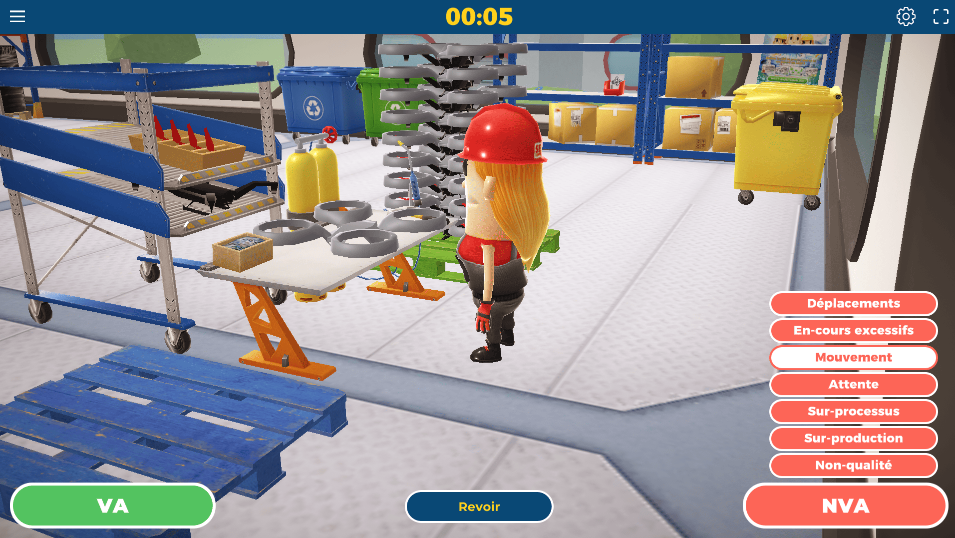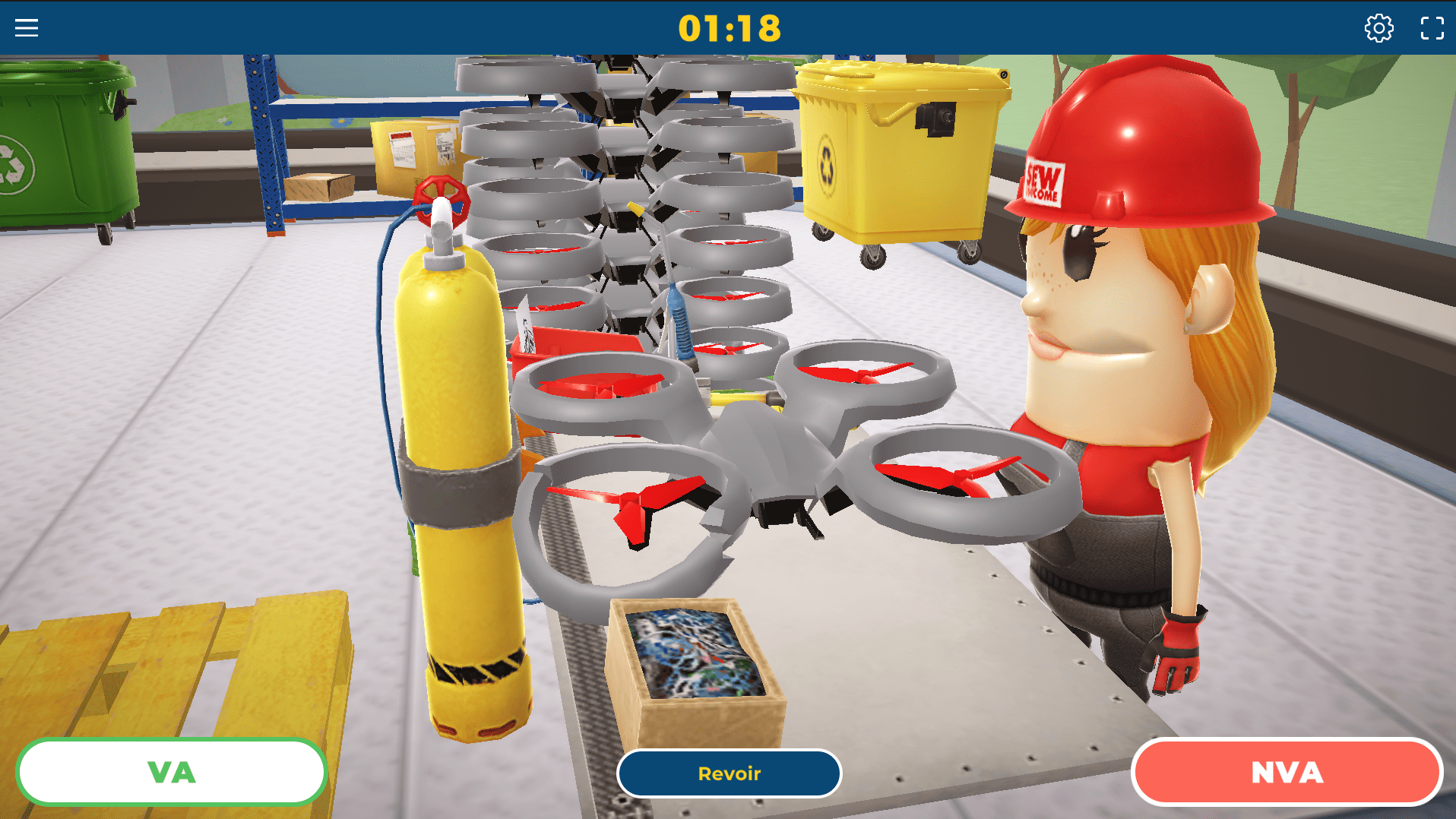 Plusieurs mini-jeux sur certains concepts précis du lean, tels que le 5S, l'analyse Rouge/Vert pour identifier la Valeur Ajoutée de la Non Valeur Ajoutée