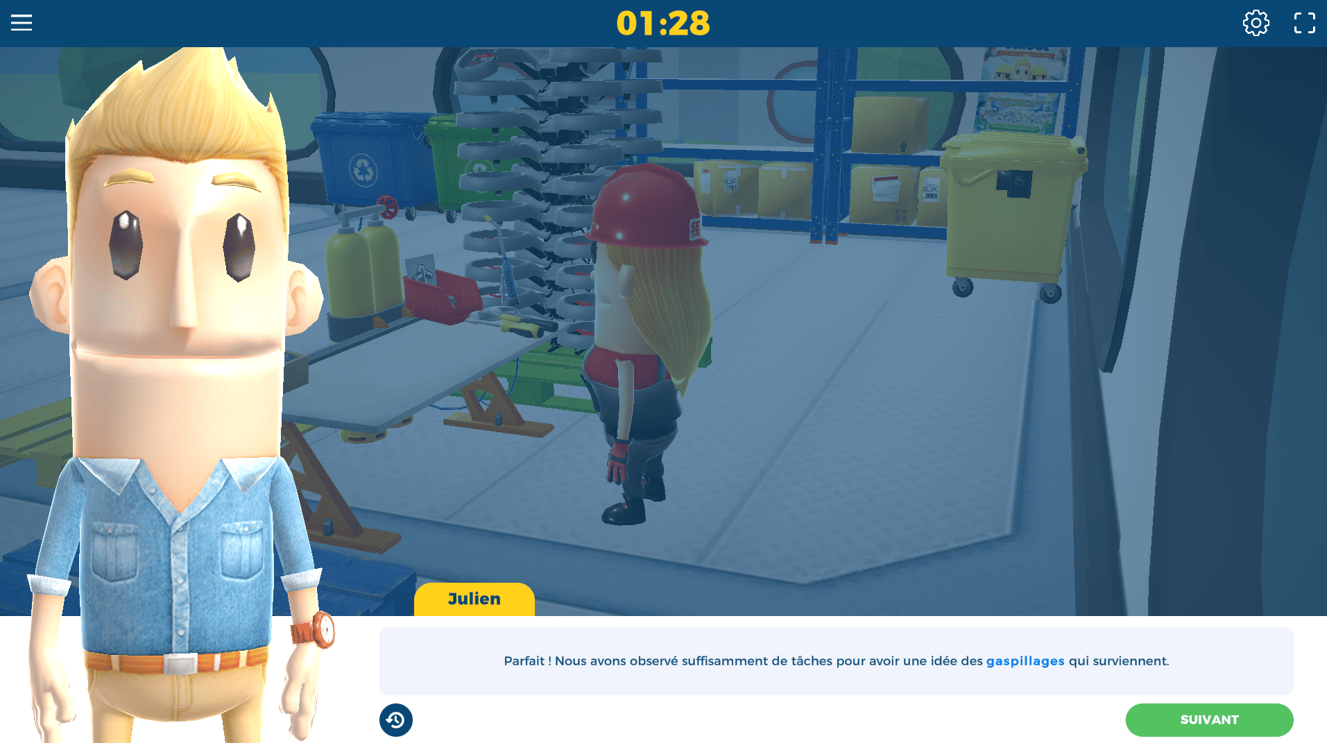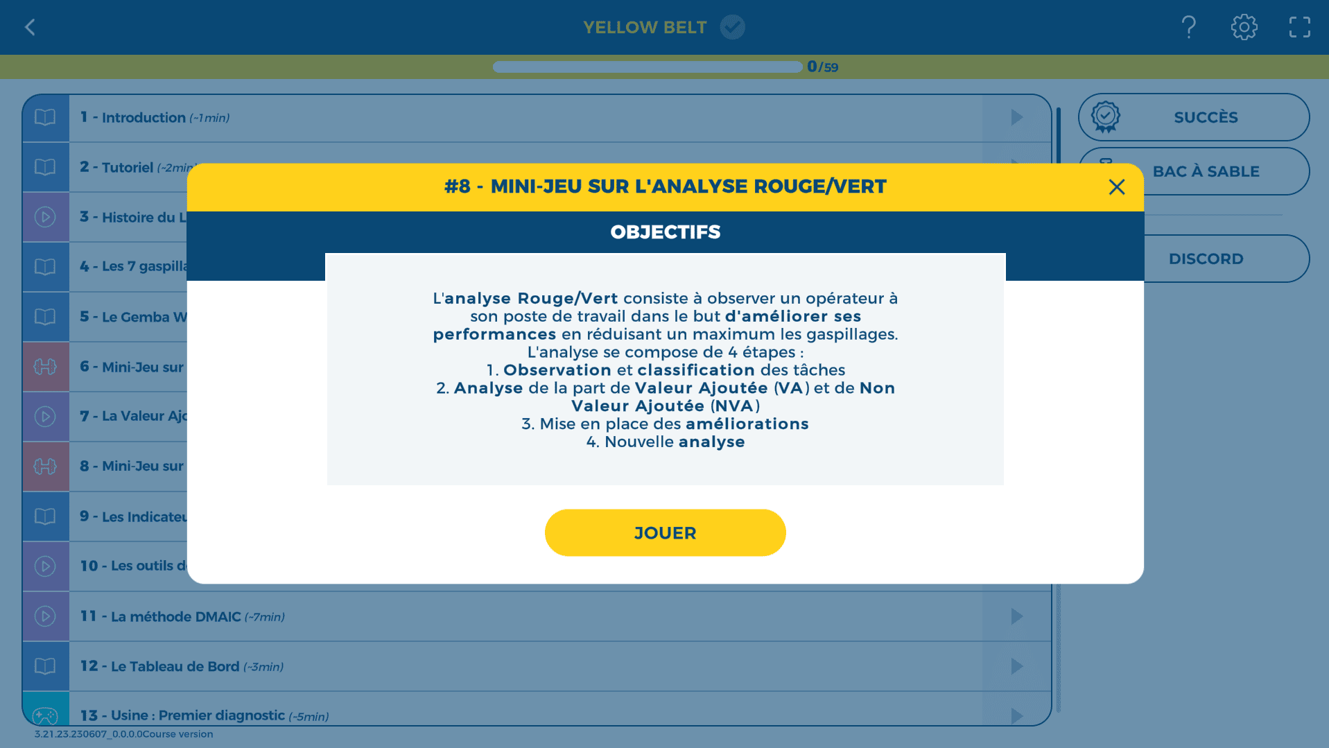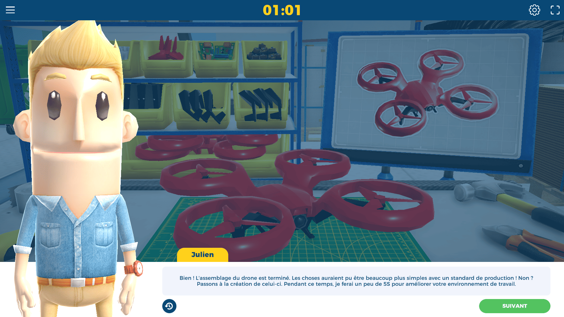 Plusieurs mini-jeux sur certains concepts précis du lean, tels que le 5S, l'analyse Rouge/Vert pour identifier la Valeur Ajoutée de la Non Valeur Ajoutée