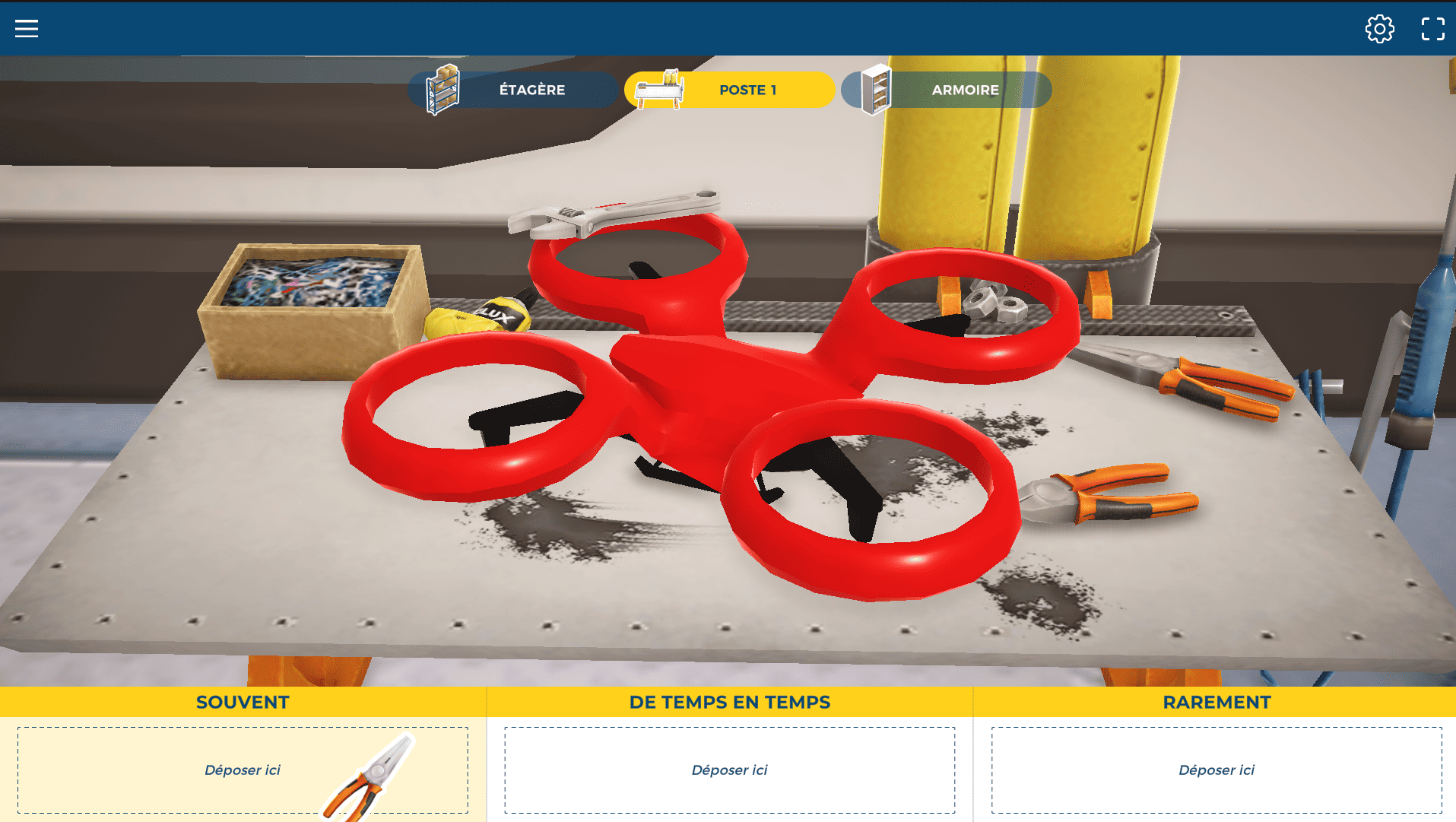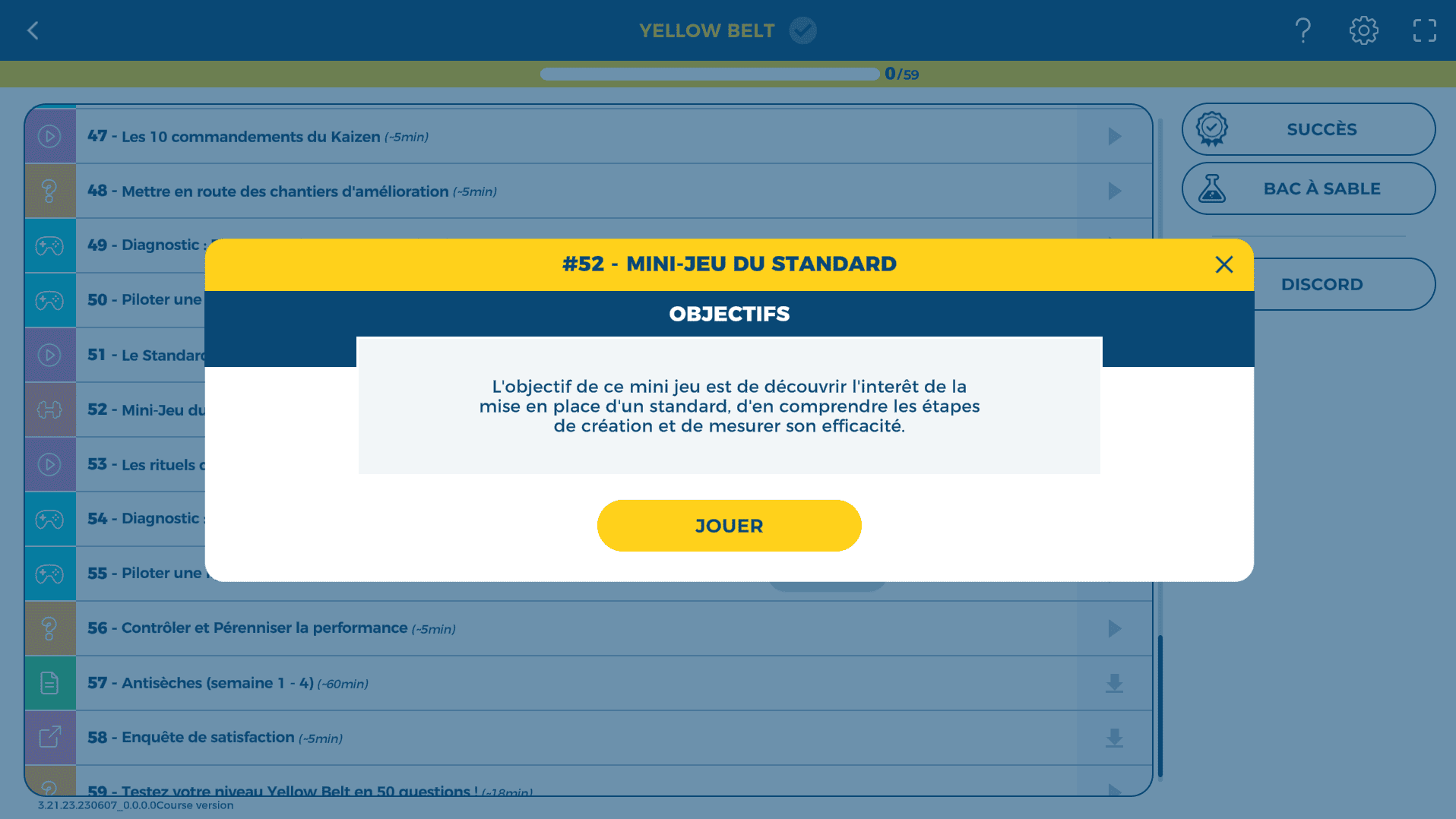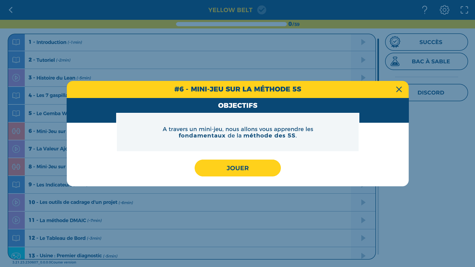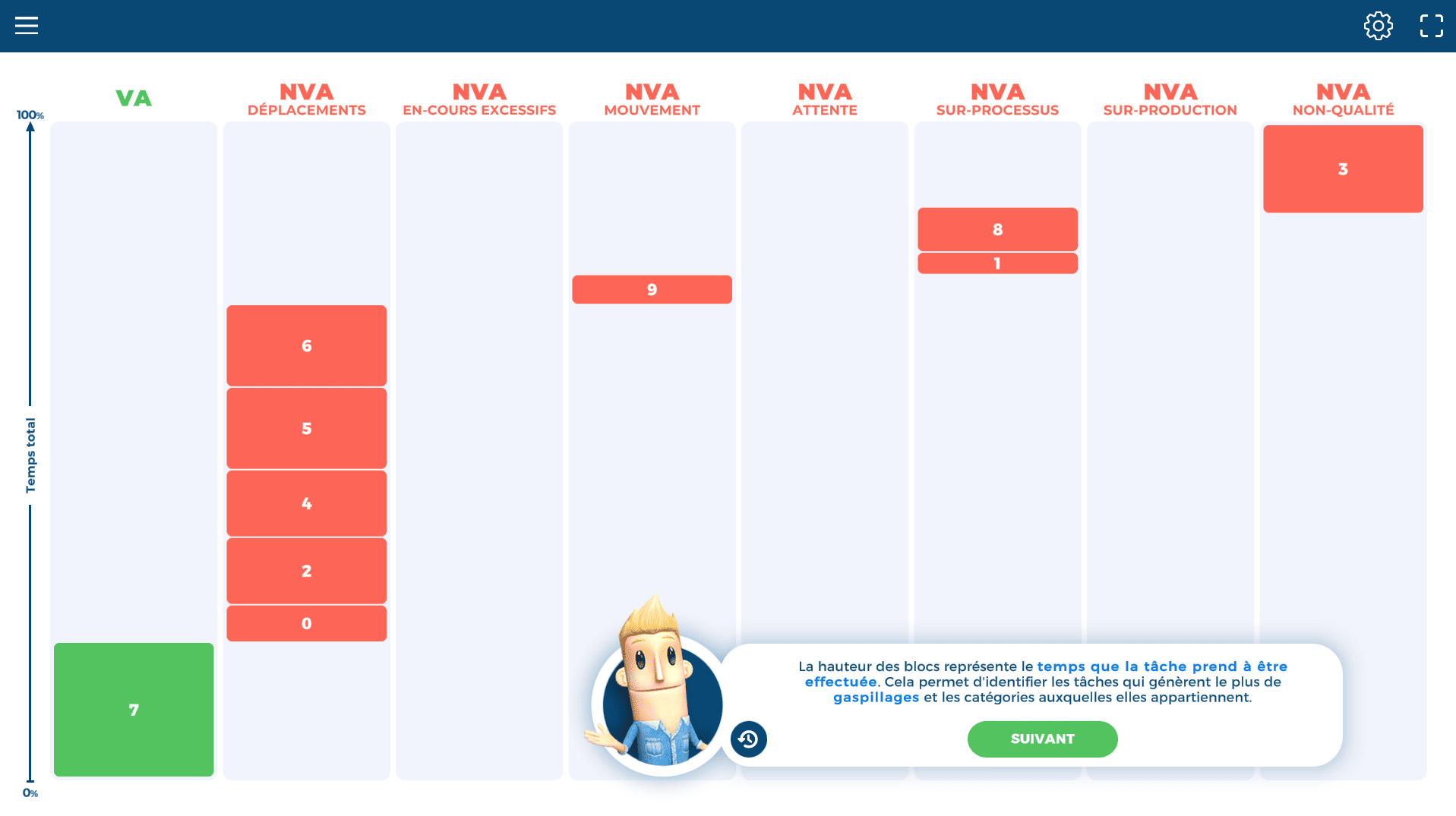 Plusieurs mini-jeux sur certains concepts précis du lean, tels que le 5S, l'analyse Rouge/Vert pour identifier la Valeur Ajoutée de la Non Valeur Ajoutée